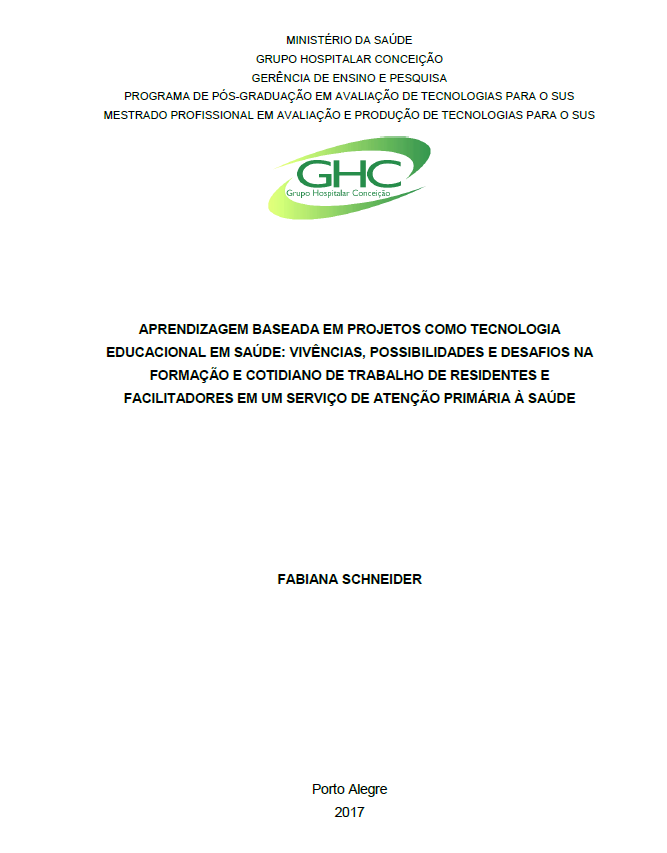 Esta dissertação é resultado do trabalho desenvolvido no Mestrado Profissional em Avaliação e Produção de Tecnologias para o SUS da Escola GHC, o qual teve como objetivo analisar a tecnologia educacional da Aprendizagem Baseada em Projetos (ABP) a partir da ótica de ex-residentes e facilitadores que vivenciaram o espaço denominado Seminário de Campo (SC) dos programas de residência Médica em Medicina de Família e Comunidade e de Residência Multiprofissional em Saúde da Família e Comunidade do Serviço de Saúde Comunitária do GHC. Também se propõe a analisar a utilização de aspectos da metodologia da ABP no cotidiano atual de trabalho dos participantes. O desenho metodológico escolhido foi a pesquisa qualitativa com abordagem de estudo de caso. Os dados foram coletados por meio de questionário sociodemográfico e entrevista semiestruturada. O tratamento dos achados pautou-se na análise temática proposta por Minayo (2008). Dentre os principais resultados destaca-se que a ABP constitui um processo pedagógico participativo que promove a elaboração de um projeto de intervenção que pode ser aplicado nos serviços de Atenção Primária à Saúde (APS). Podemos então concluir que a ABP demonstra ser uma potente ferramenta metodológica, ampliando as possibilidades de integração dos conhecimentos adquiridos teoricamente, aplicando-os na prática dos processos de trabalho em saúde, especificamente no âmbito da APS e, consequentemente, no Sistema Único de Saúde.